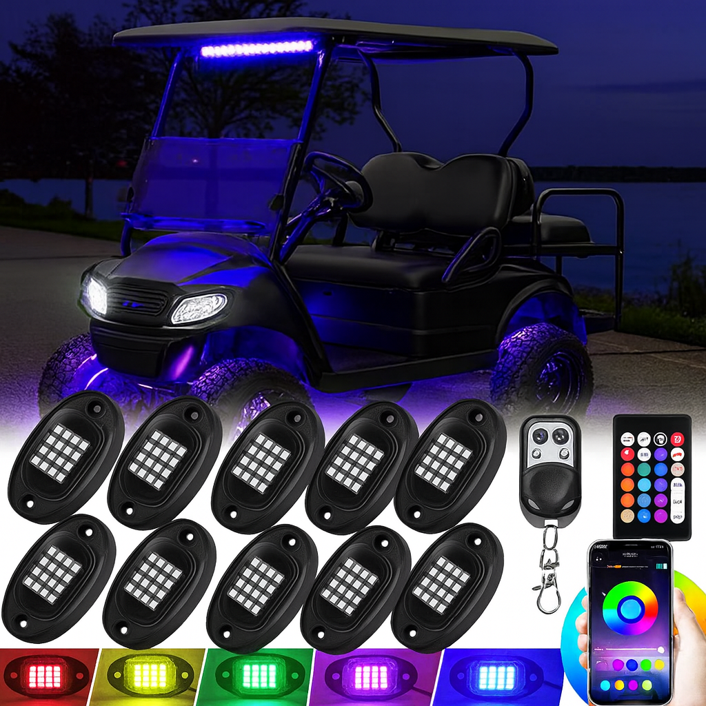 8-Pod RGB LED Rock Light Kit for Golf Carts — Waterproof, Multicolor Underglow with App Control, Music Mode, and 12V Underbody Accent Lighting